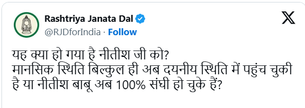 The RJD also criticised Nitish Kumar, questioning his behaviour and mental condition. In a post on X, the party alleged that the Chief Minister had aligned himself completely with the Sangh Parivar ideology and described his conduct as unacceptable.