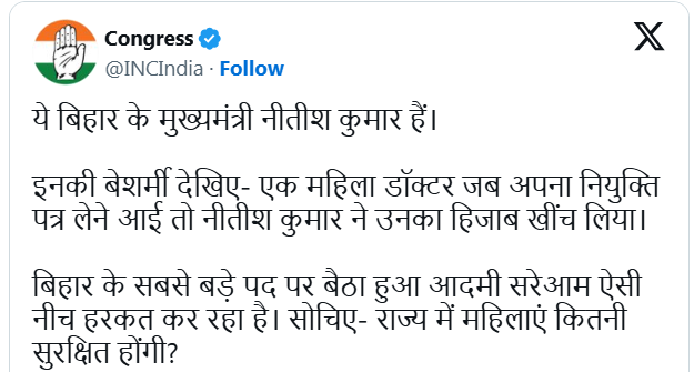 Reacting strongly, the Congress accused Nitish Kumar of inappropriate behaviour. In a post on X, the party termed the act “shameless” and questioned the safety of women in Bihar under his leadership. The Congress also demanded the Chief Minister’s resignation over the incident.