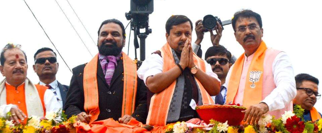 Standing atop a vehicle decorated with flowers and cut-outs of the party’s poll symbol, the lotus, Nabin waved at thousands of supporters lining both sides of the road. People showered flower petals on his cavalcade while chanting slogans of “Bharat Mata Ki Jai.”