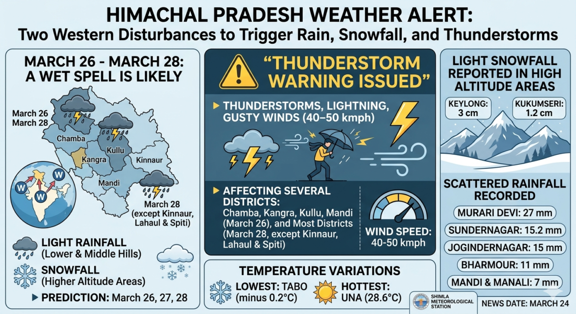 According to the Shimla Meteorological Station, light rainfall is expected in the lower and middle hill regions, while higher altitude areas may witness snowfall or precipitation. A wet spell is likely to persist across the state from March 26 to March 28.
