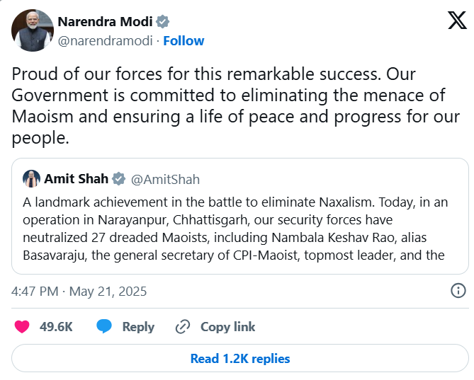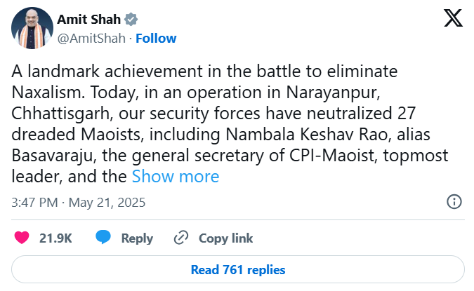 “This is a landmark achievement in our battle to eliminate Naxalism,” Shah posted on social media platform X. “It is the first time in over 30 years that a general secretary-ranked Maoist leader has been neutralised.”