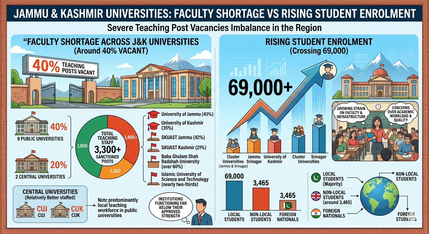 Cluster University Jammu and Cluster University Srinagar have the highest enrolments, followed by the University of Kashmir. The rising student numbers, coupled with faculty shortages, have raised concerns over academic workload and quality of education.