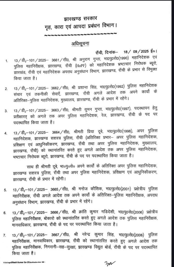 Other important transfers include Wireless DG Prashant Singh, who gets the additional charge of DG Headquarters, and IPS Suman Gupta, who has been made Railway ADG. IPS Priya Dubey has taken over as ADG of ACB. Ranchi IG Manoj Kaushik will now also handle the charge of IG CID.