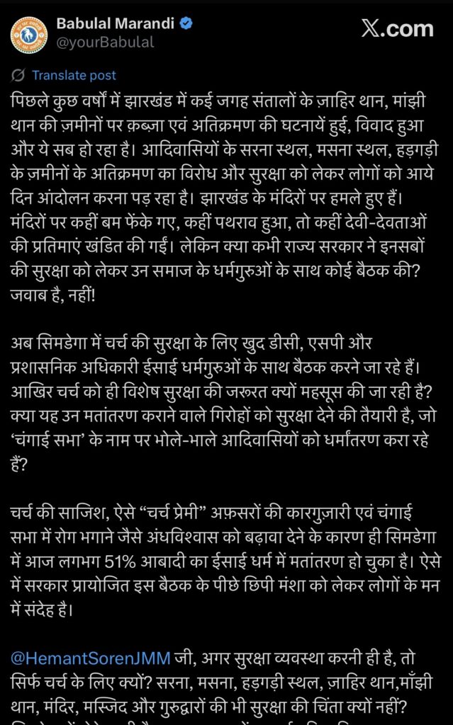 Marandi said that while the administration is holding special meetings for church security, tribal religious sites continue to face neglect. He pointed out that places like Jaher Than, Manjhi Than, Sarna Sthal, Masna Bhumi, and Hadgadi have been encroached upon in recent years.