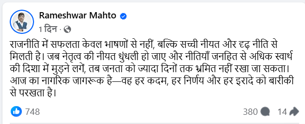 Taking to social media, Mahto wrote that success in politics is not achieved merely through speeches but through genuine intentions and strong policies. Without naming anyone directly, he remarked that when leadership intent becomes unclear and policies begin to tilt towards self-interest rather than public welfare, the public cannot be misled for long.