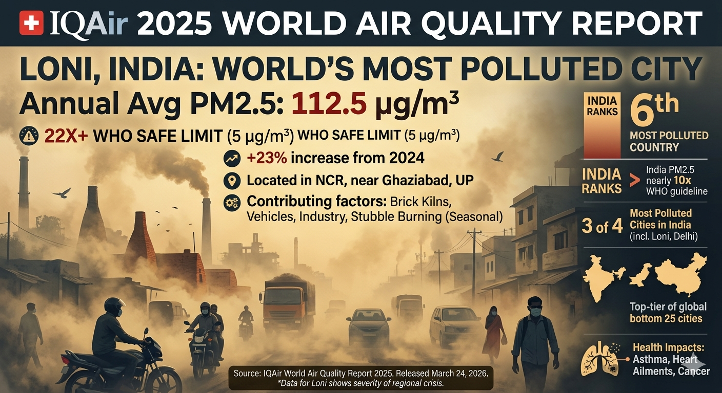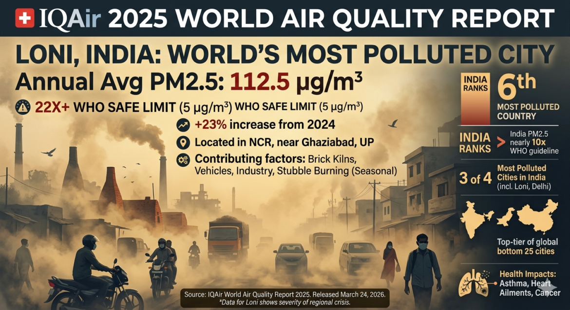 Loni, located in the National Capital Region (NCR), has been ranked the most polluted city globally, recording an alarming annual average PM2.5 concentration of 112.5 micrograms per cubic metre, nearly 23 per cent higher than 2024 levels and more than 22 times the safe limit prescribed by the World Health Organization (WHO).