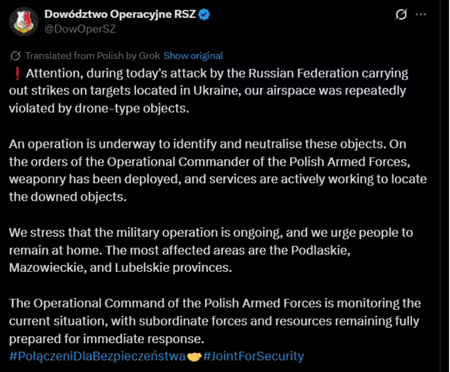 Authorities closed Warsaw Chopin Airport, Rzeszów–Jasionka Airport, Warsaw Modlin Airport and Lublin Airport. A U.S. Federal Aviation Administration notice cited “unplanned military activity related to ensuring state security” as the reason for the closures.